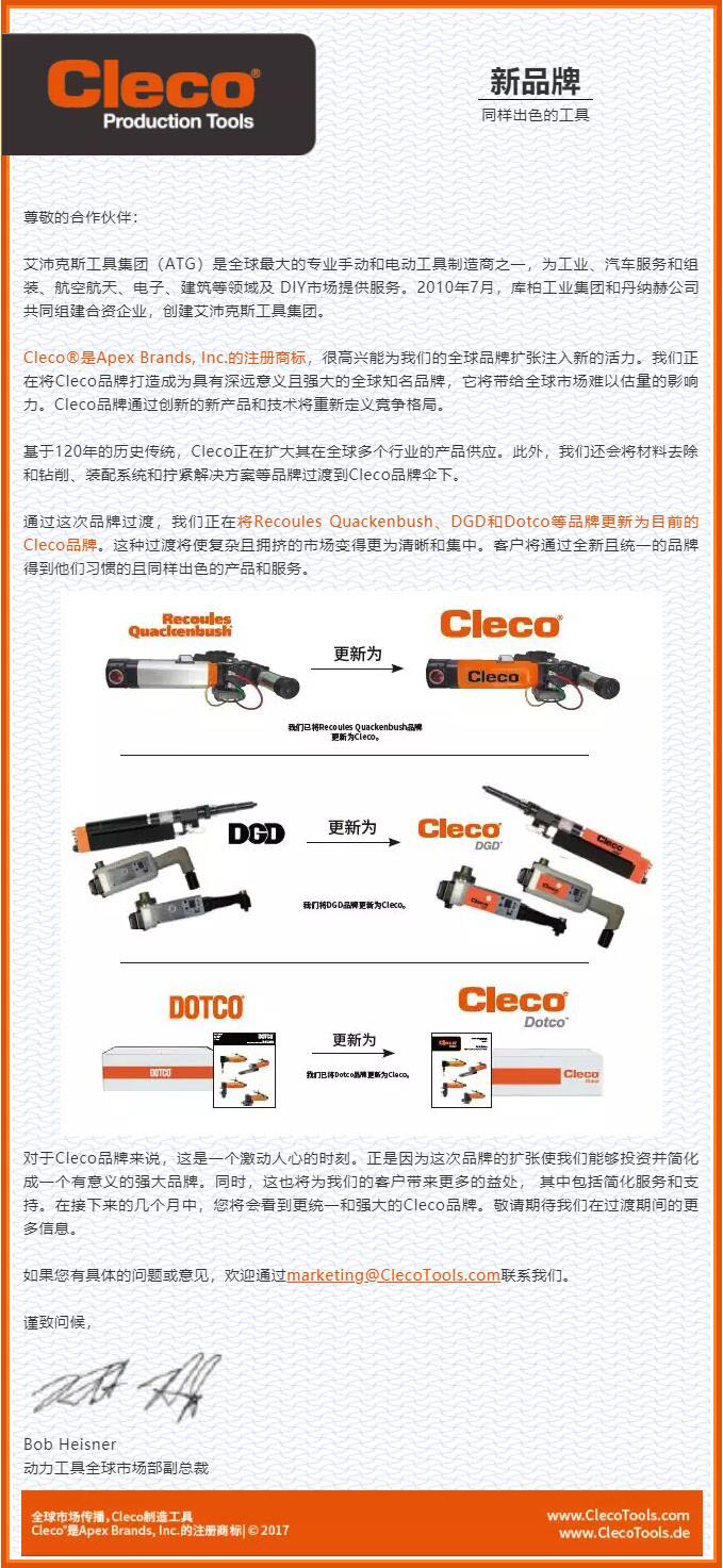 Cleco®是Apex Brands, Inc.的注冊(cè)商標(biāo),很高興能為我們的全球品牌擴(kuò)張注入新的活力。我們正在將Cleco品牌打造成為具有深遠(yuǎn)意義且強(qiáng)大的全球知名品牌,它將帶給全球市場(chǎng)難以估量的影響力。Cleco品牌通過創(chuàng)新的新產(chǎn)品和技術(shù)將重新定義競(jìng)爭(zhēng)格局。